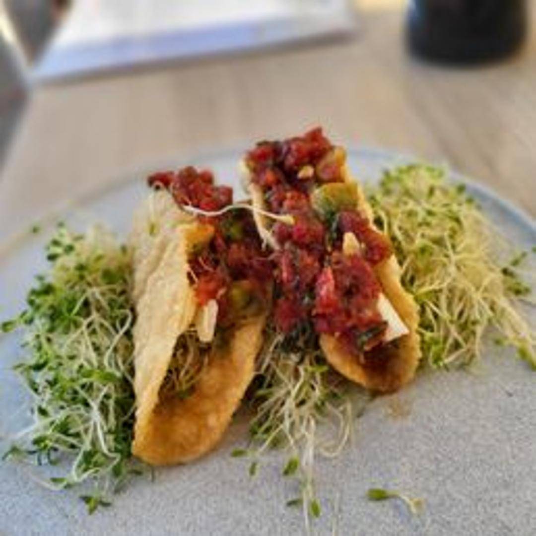 Plant-based tuna alternative with spicy mayo, avocado, cucumber, and crispy tempura flakes, rolled in nori and sushi rice.