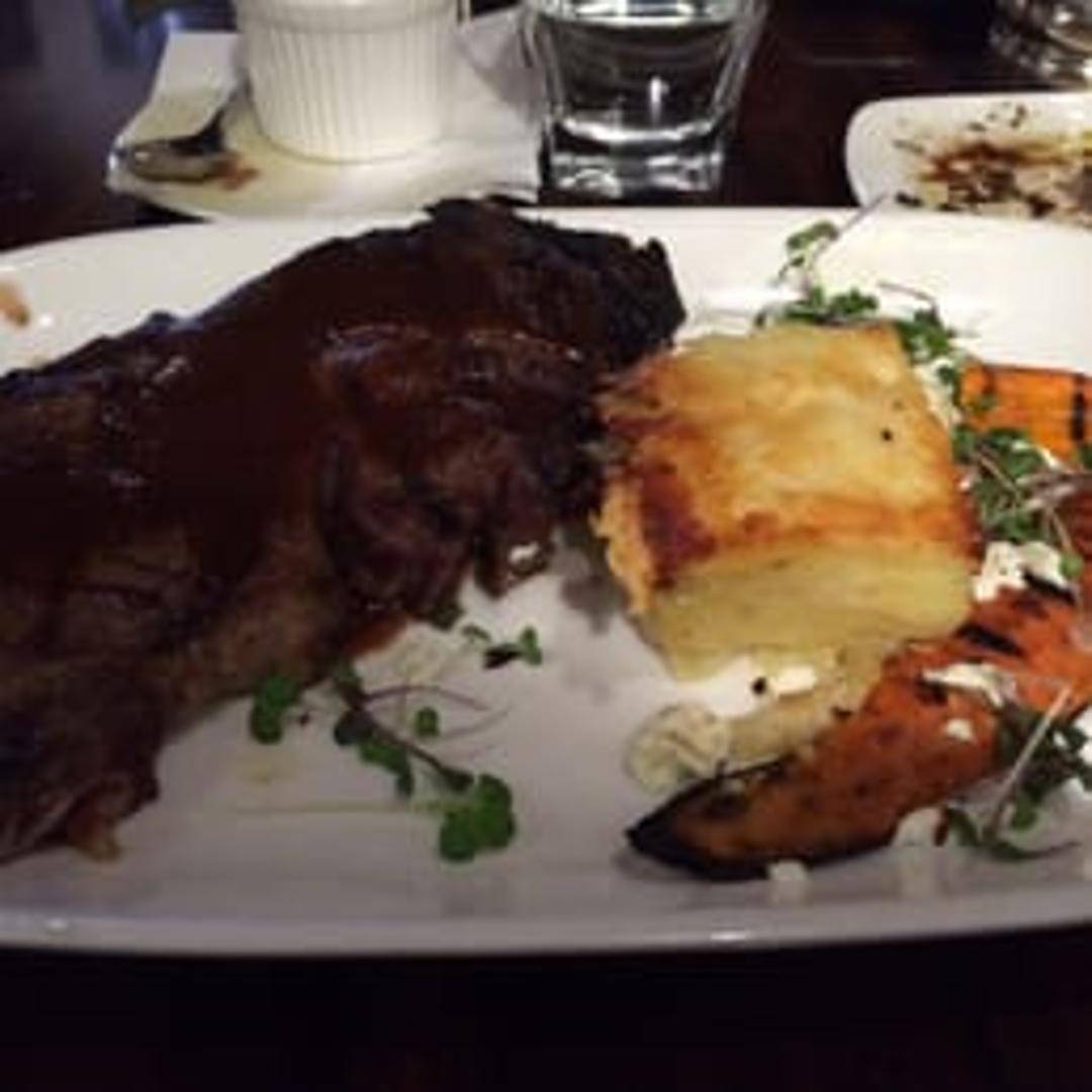 A perfectly grilled, generously marbled rib eye steak, known for its rich flavor and tenderness. Served with your choice of two sides: roasted potatoes, seasonal vegetables, mashed potatoes, or mac & cheese. Cooked to your desired temperature.