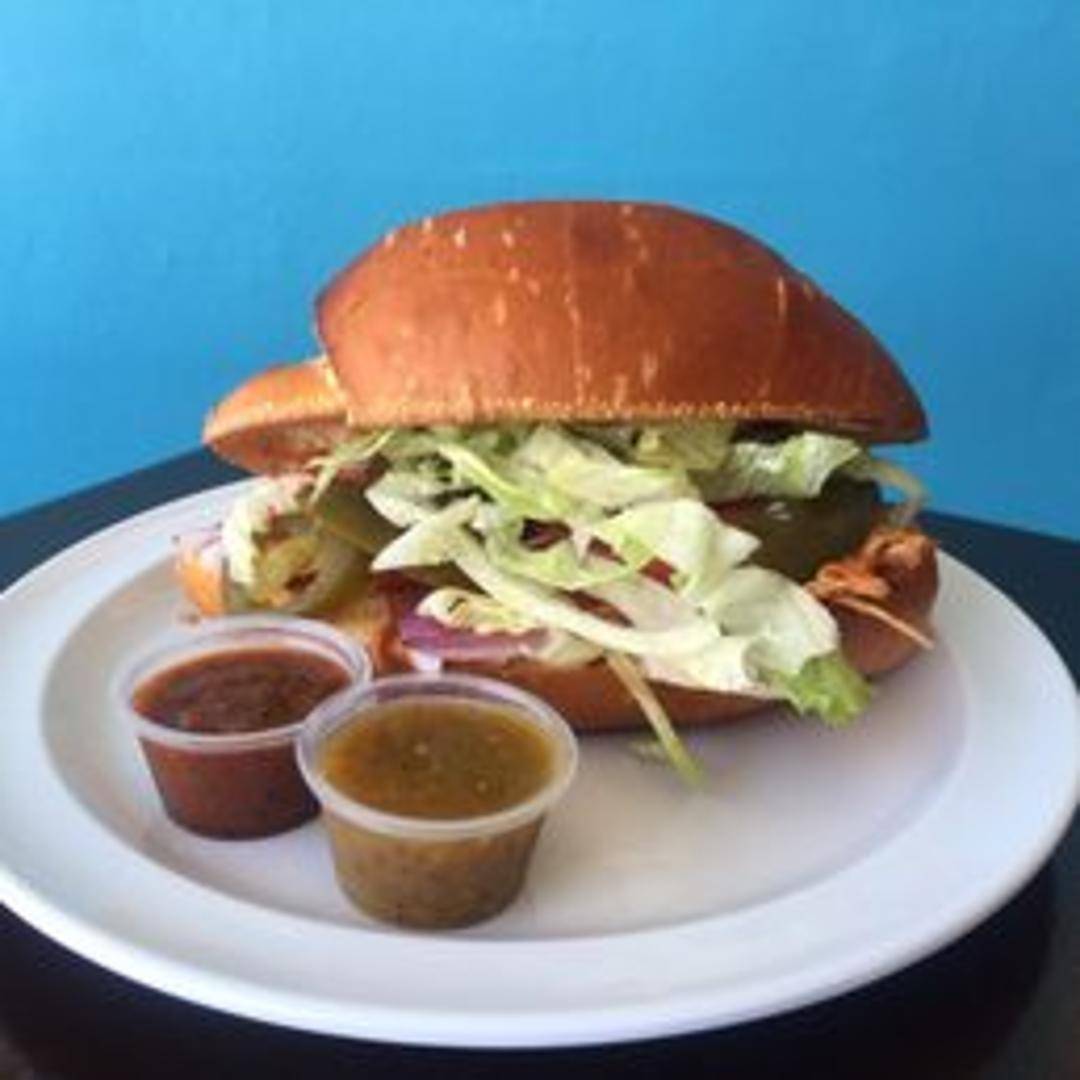 A Mexican sandwich filled with seasoned shredded chicken, lettuce, tomato, onion, avocado, and your choice of condiments, served on a toasted bolillo roll.