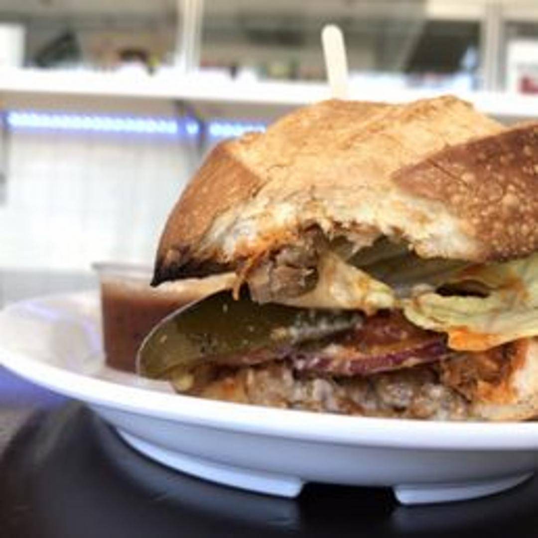 A Mexican sandwich filled with marinated pork cooked on a vertical spit, lettuce, tomato, onion, avocado, and your choice of condiments, served on a toasted bolillo roll.