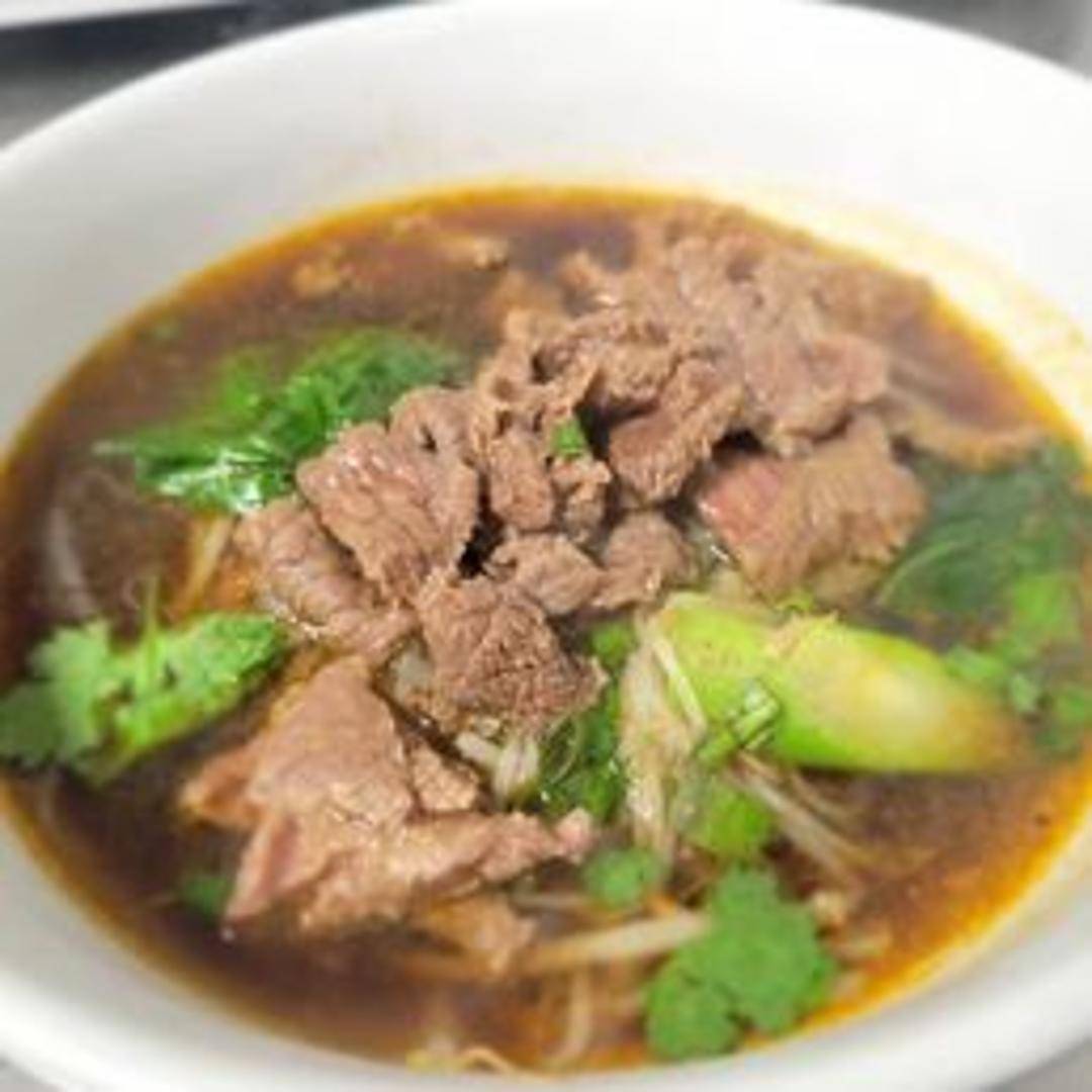 A hearty and flavorful soup with tender slices of beef, rice noodles, and a savory broth. Garnished with herbs and vegetables.