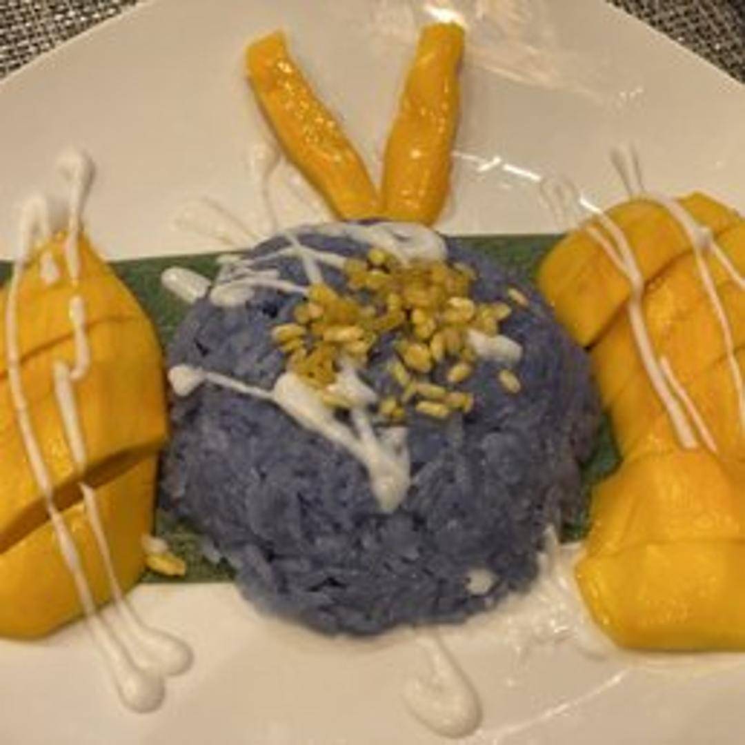 Sweet sticky rice topped with slices of fresh ripe mango and drizzled with coconut milk. A classic Thai dessert.