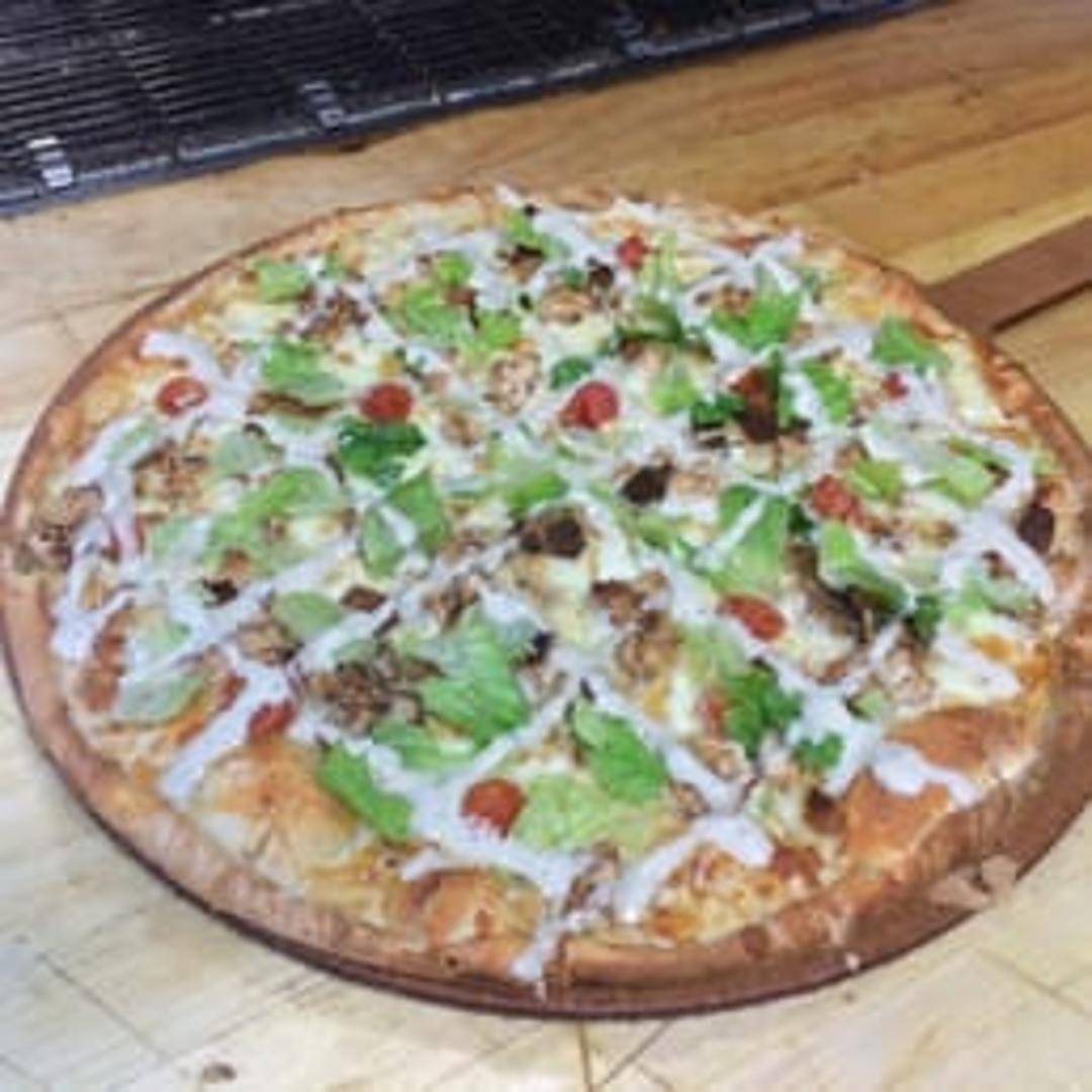 Classic pizza crust topped with creamy Caesar dressing, mozzarella cheese, grilled chicken or crispy bacon (optional), romaine lettuce, and parmesan cheese. Available in various sizes.