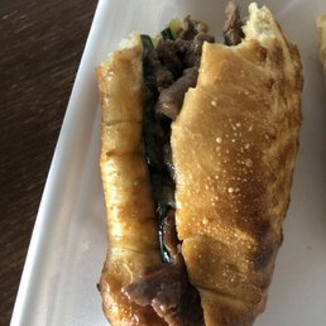 A fusion sandwich featuring thinly sliced, marinated bulgogi (Korean BBQ beef), pickled carrots and daikon radish, cucumber, cilantro, jalapeños, and a savory aioli spread on a toasted baguette.