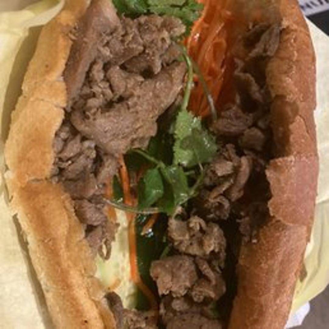 A Vietnamese sandwich featuring slices of marinated grilled pork, pickled carrots and daikon radish, cucumber, cilantro, jalapeños, and a savory aioli spread on a toasted baguette.