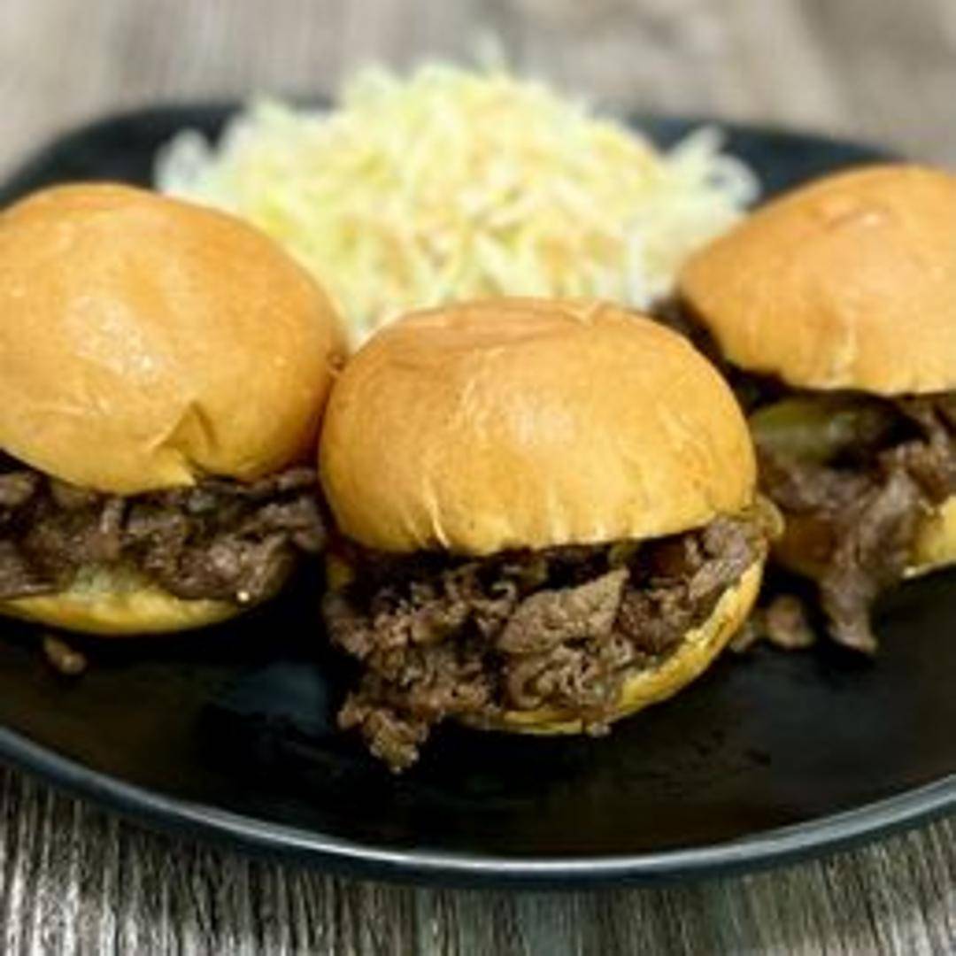 Three mini-burgers featuring tender, marinated bulgogi (Korean BBQ beef) served on soft slider buns. Topped with a complementary slaw or sauce.