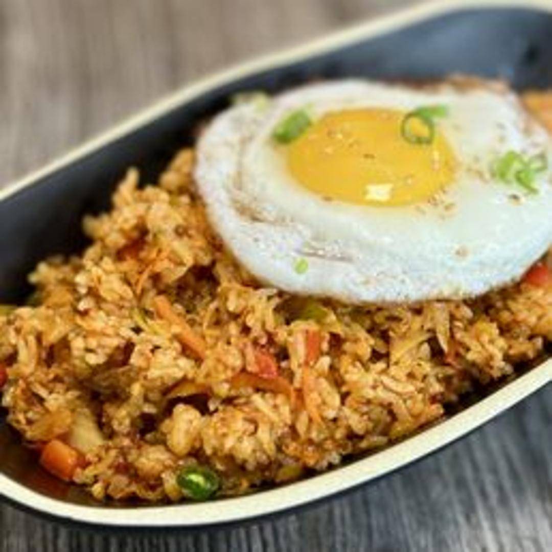 Savory fried rice stir-fried with aged kimchi, vegetables, and often includes a protein like pork or spam. Topped with a fried egg for added richness and a sprinkle of seaweed flakes. Spicy, tangy, and umami-packed.