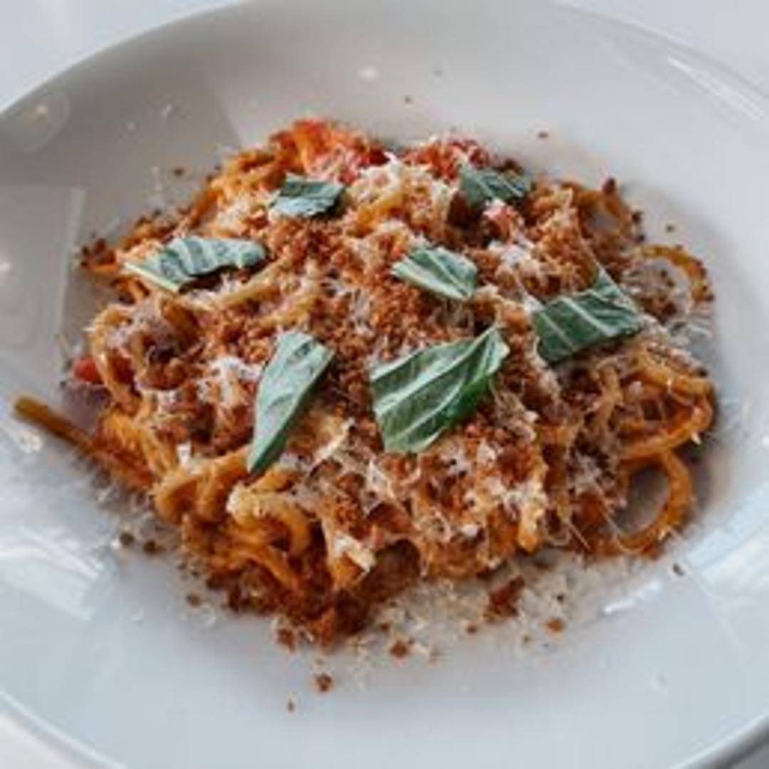 Thick, spaghetti-like pasta with a hole running through the center, tossed in a simple and fresh tomato sauce, often with garlic, basil, and olive oil.