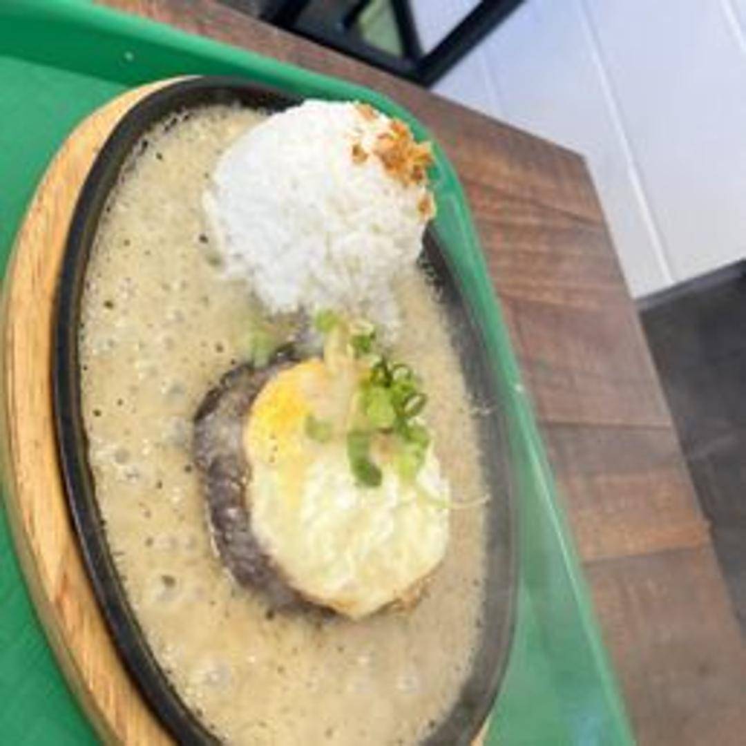 A bed of steamed rice topped with a juicy hamburger patty, a fried egg, and smothered in rich gravy.