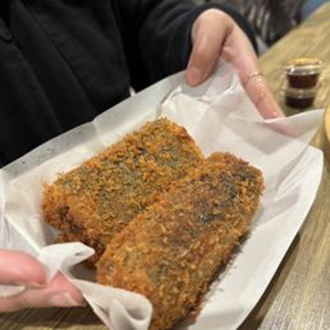 A grilled slice of Spam atop a block of seasoned rice, wrapped together with nori seaweed.