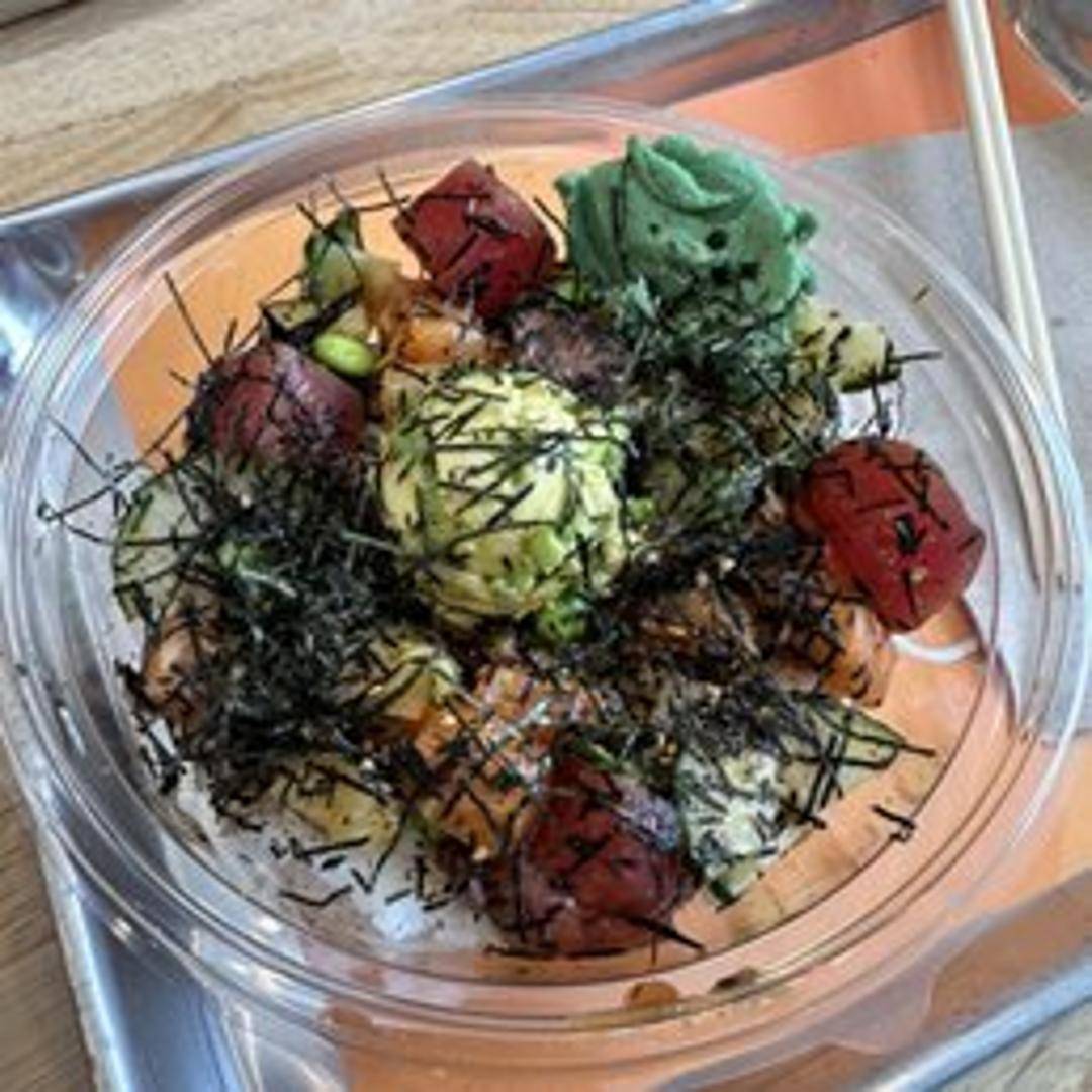A customizable bowl featuring your choice of protein (tuna, salmon, chicken, tofu, etc.), rice (white or brown), various mix-ins (seaweed salad, edamame, cucumber, etc.), flavorful sauces (classic, spicy, sweet), and toppings (sesame seeds, tempura flakes, crispy onions, etc.) for a personalized poke experience.