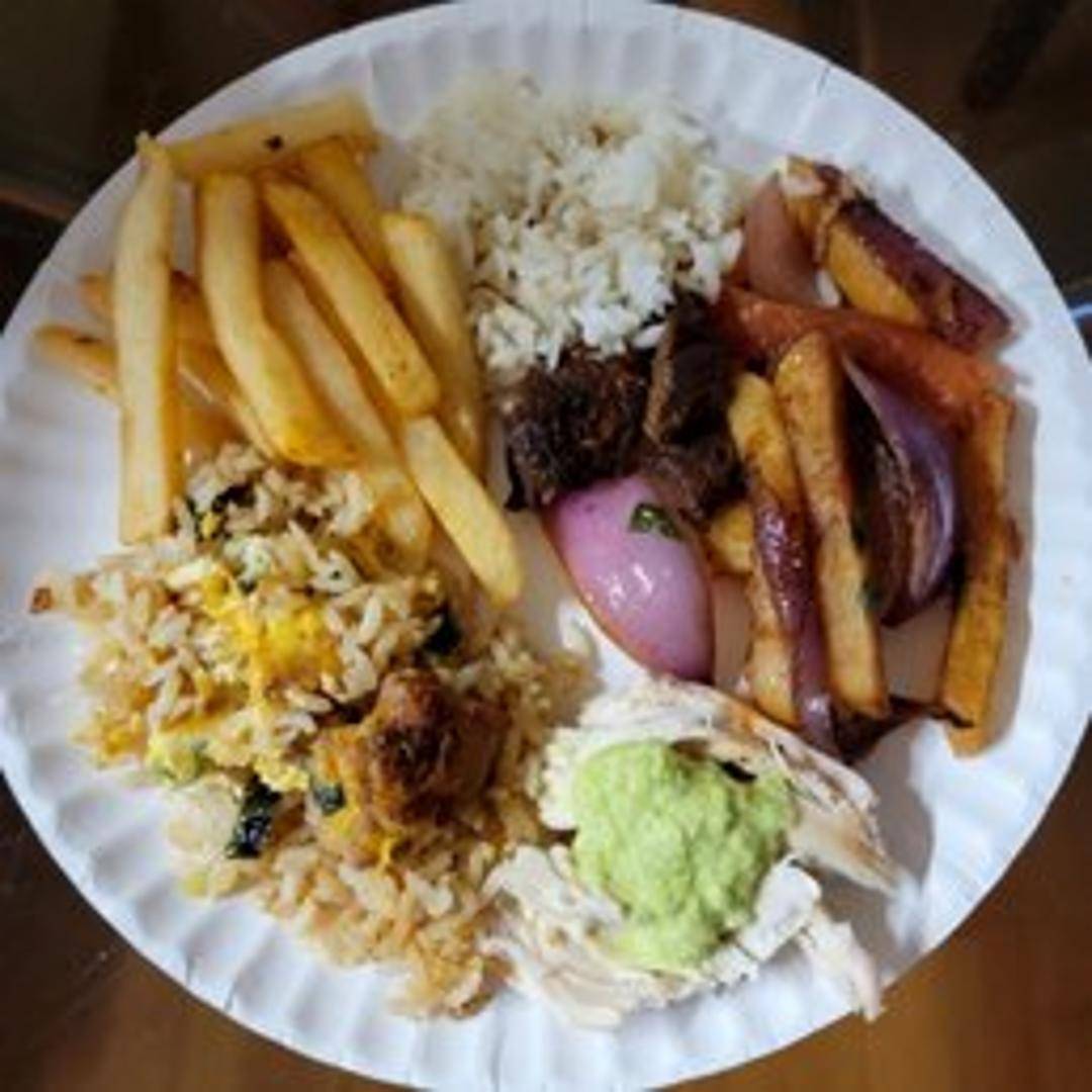 A whole roasted chicken, marinated in traditional Peruvian spices and herbs. Crispy skin and juicy, flavorful meat. Served with your choice of sides, such as rice, beans, salad, or fries. A perfect option for sharing.