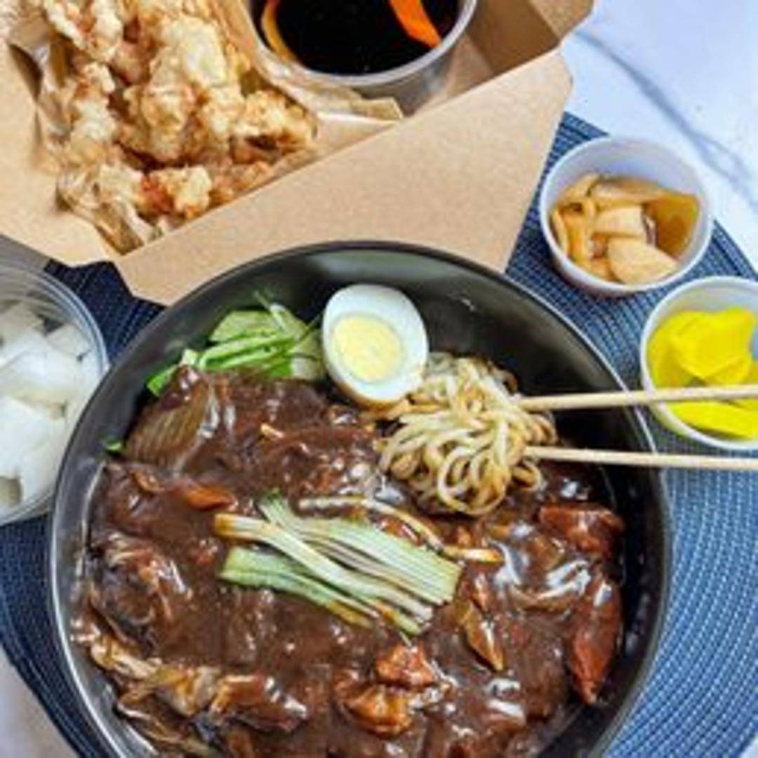 Korean-Chinese inspired noodles tossed in a savory black bean sauce, featuring diced pork, onions, and zucchini. A rich and flavorful dish with a slightly sweet and umami taste.