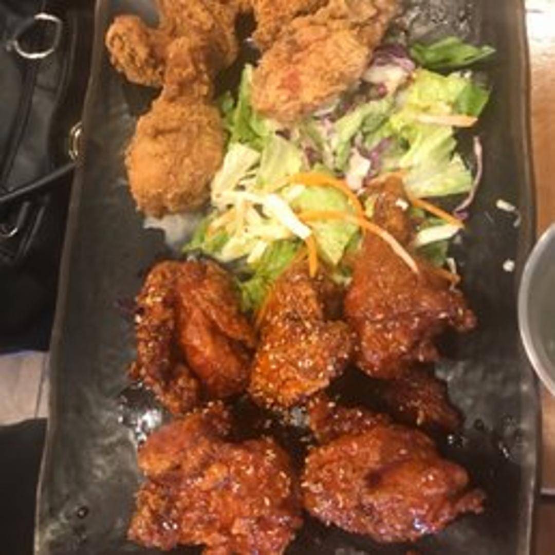 A whole chicken prepared in two distinct flavor profiles. One half is typically a crispy fried chicken, seasoned with a blend of spices. The other half is often a marinated and grilled chicken, offering a contrasting flavor and texture. Served with a side of pickled radish and dipping sauces.