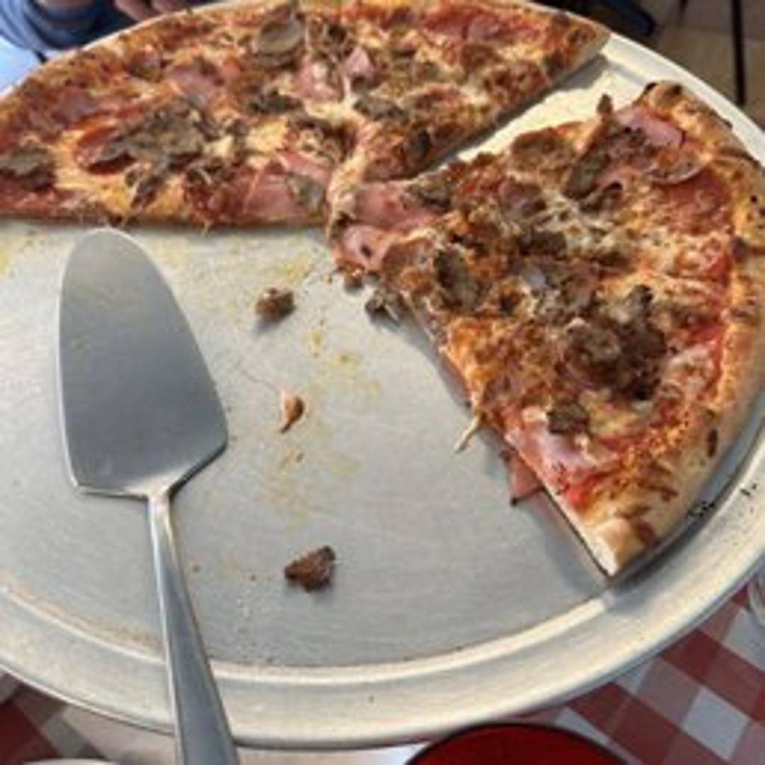 A hearty pizza loaded with a variety of meats, including pepperoni, sausage, ham, and bacon, smothered in mozzarella cheese and our signature tomato sauce.
