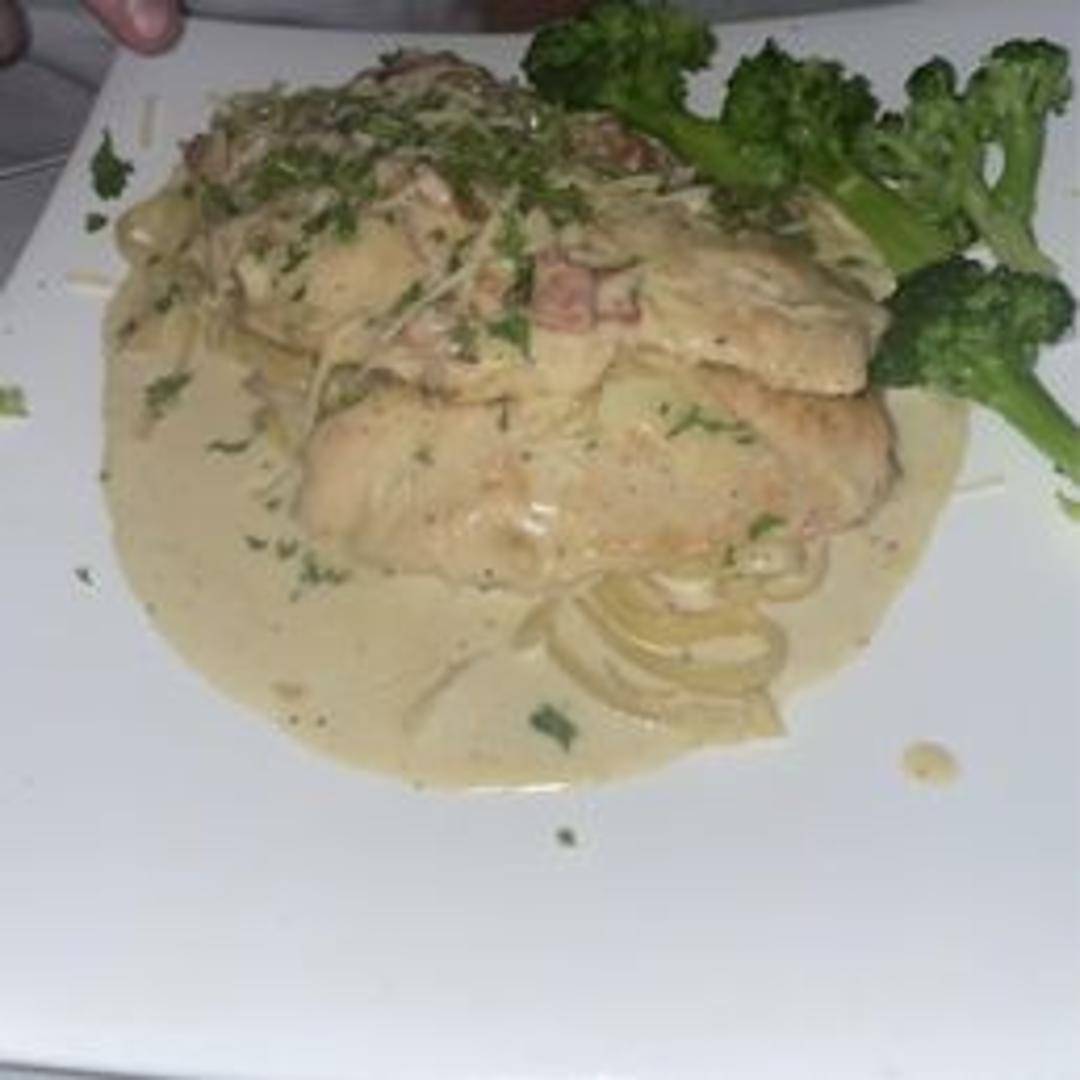 Tender pieces of grilled chicken tossed in a creamy carbonara sauce made with eggs, Parmesan cheese, pancetta, and black pepper, served over your choice of pasta.
