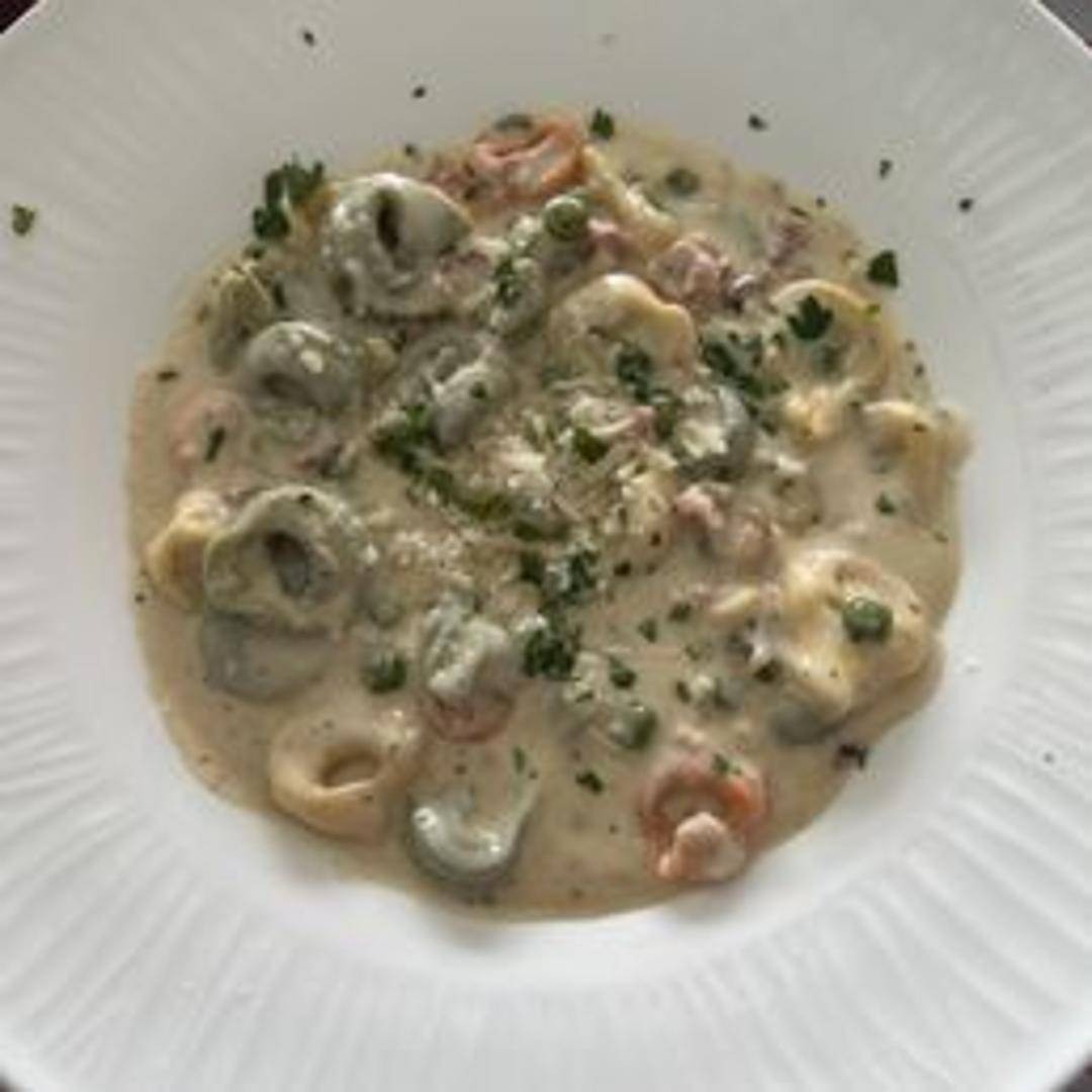 Cheese-filled tortellini tossed in a creamy carbonara sauce made with eggs, Parmesan cheese, pancetta, and black pepper.