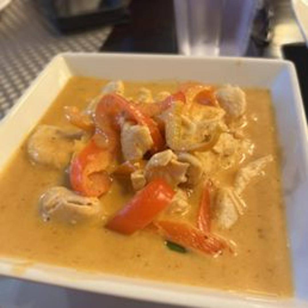 A rich and creamy Thai curry made with coconut milk, panang curry paste, bell peppers, and your choice of protein. Features a mild, nutty flavor with hints of citrus and spice, often garnished with kaffir lime leaves.