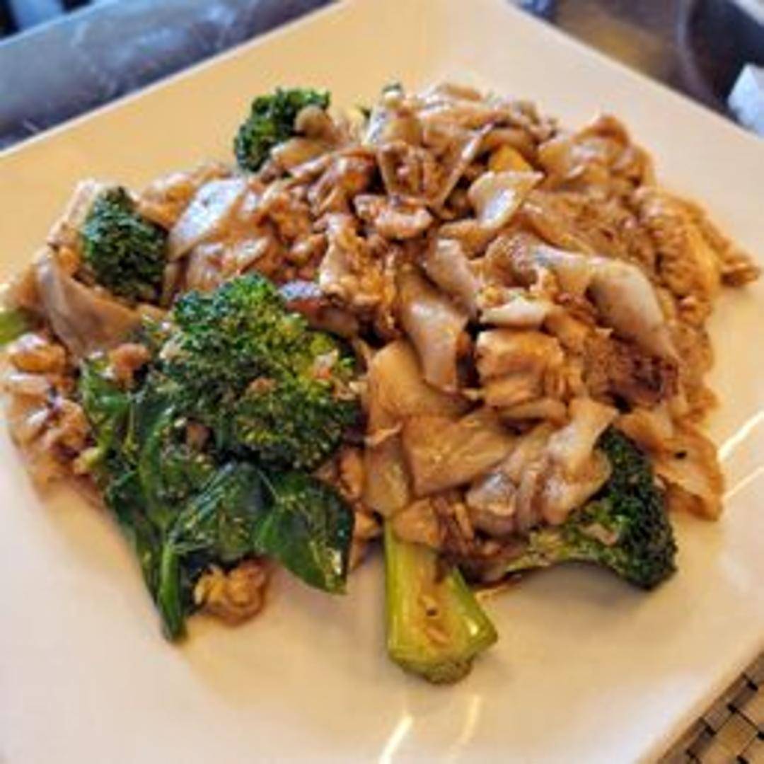 Wide rice noodles stir-fried with Chinese broccoli, egg, and your choice of protein in a sweet and savory dark soy sauce-based sauce. A classic Thai noodle dish with a slightly charred flavor.