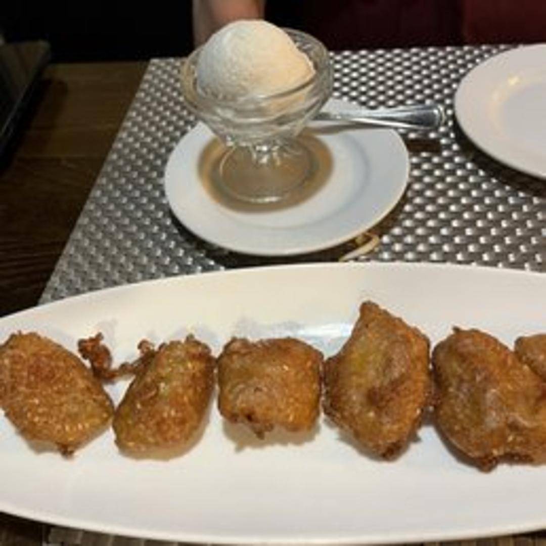 Sliced bananas battered and deep-fried until golden brown and crispy. Served with a drizzle of honey and a sprinkle of sesame seeds. Often served with a scoop of vanilla ice cream.
