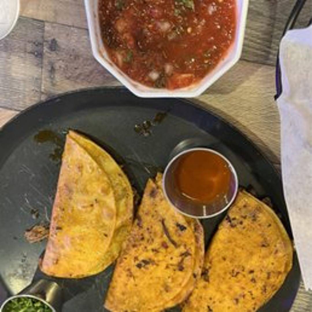Three slow-braised, flavorful beef tacos served in corn tortillas dipped in birria consommé and grilled. Accompanied by a side of consommé for dipping, chopped onions, cilantro, and lime wedges.