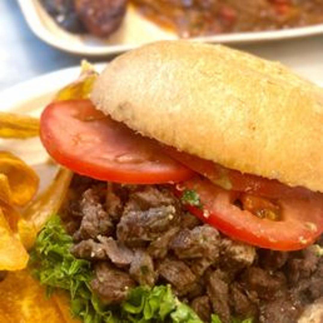A savory sandwich featuring tender, thinly sliced steak, refried beans, avocado, tomatoes, onions, and jalapeños, served on a crusty roll.