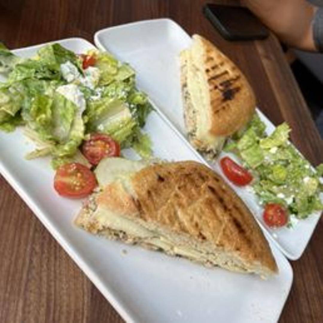 Albacore tuna mixed with Mediterranean flavors, including sun-dried tomatoes, artichoke hearts, and pesto, pressed in a warm panini.