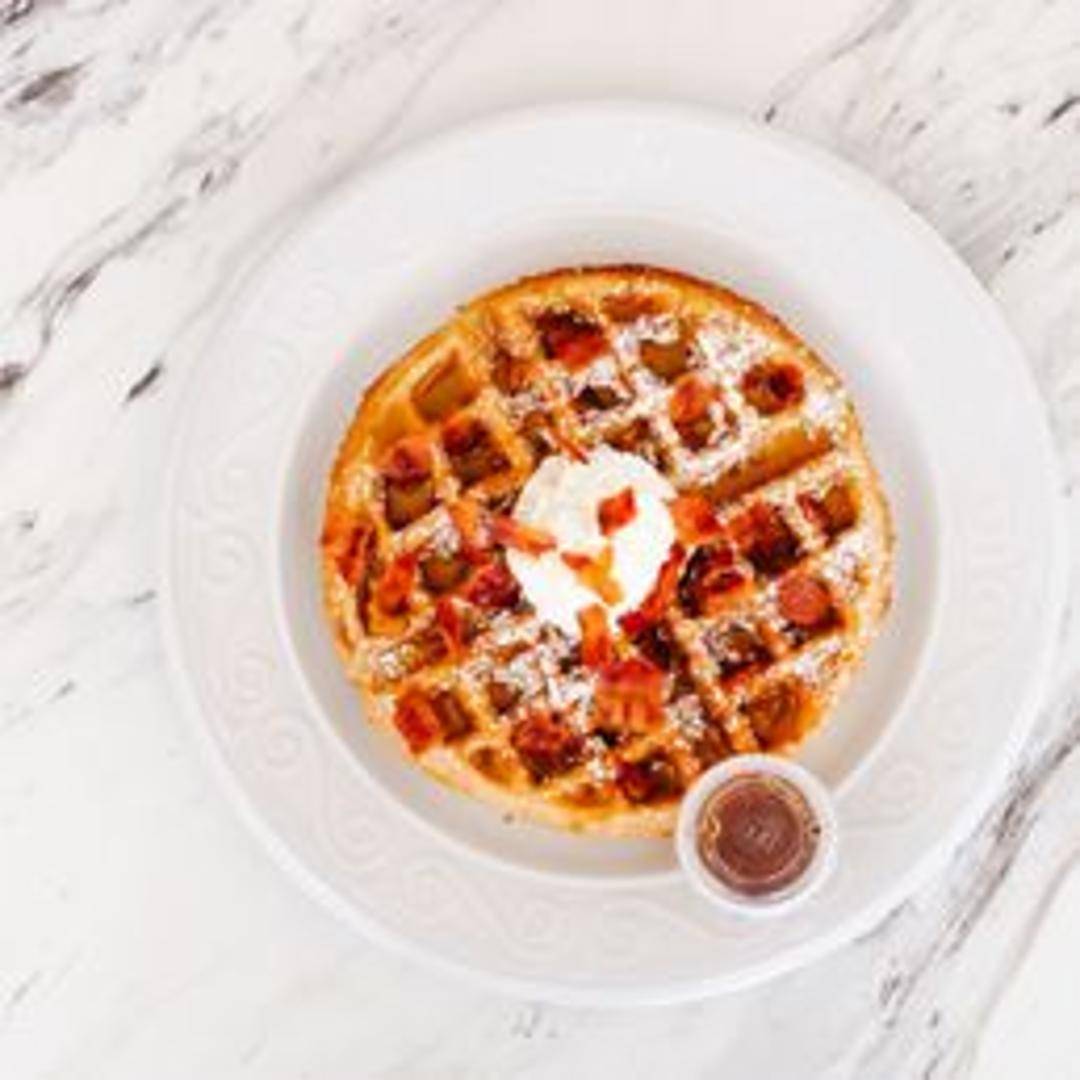 A sweet and savory waffle featuring crispy bacon pieces cooked right into the batter, drizzled with real maple syrup. A delicious breakfast or brunch treat.