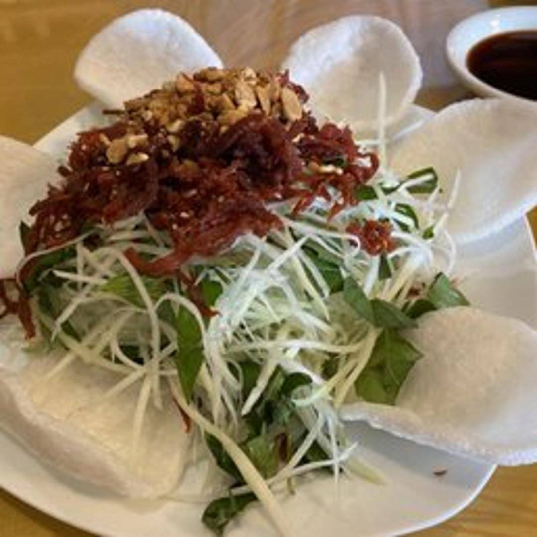 A vibrant and refreshing salad featuring crisp, shredded green papaya as its base. This invigorating dish is artfully tossed with fresh herbs, crunchy peanuts, and a medley of colorful vegetables, all united by a zesty, sweet, sour, and spicy dressing that awakens the palate with every bite.