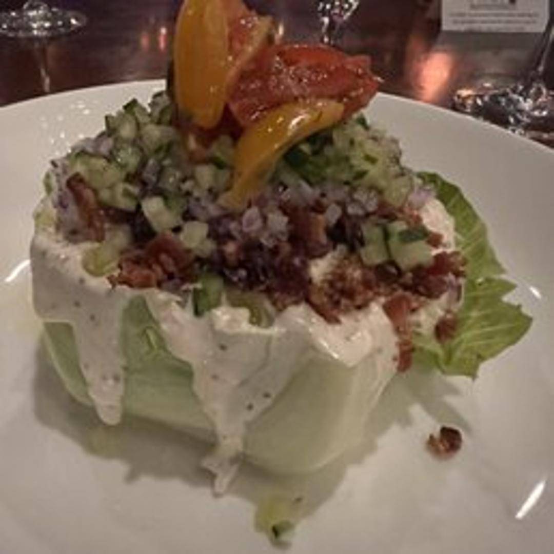 A crisp wedge of iceberg lettuce topped with crumbled blue cheese, bacon, tomatoes, and your choice of blue cheese or ranch dressing.