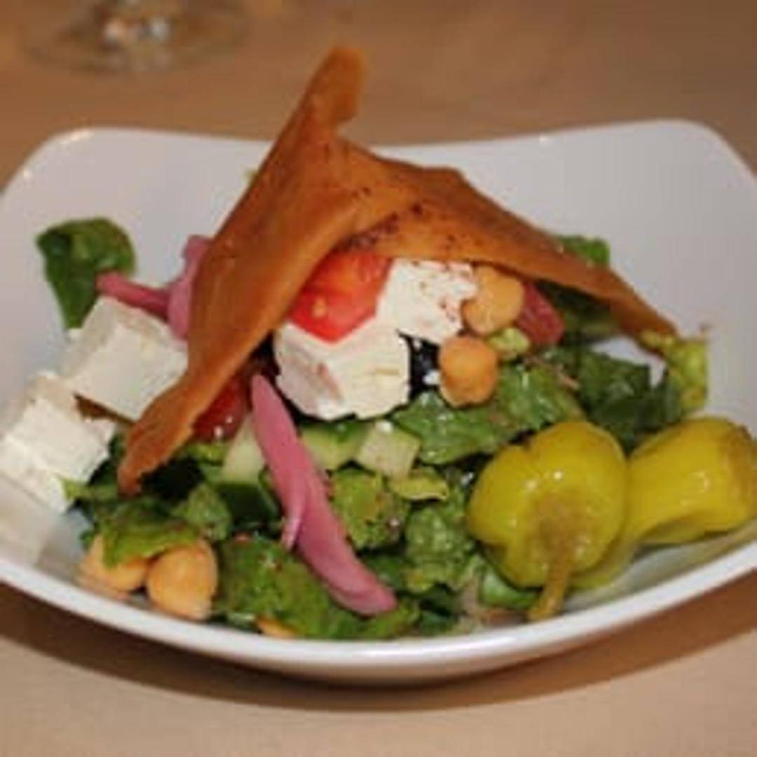 A refreshing chopped salad featuring crisp romaine lettuce, cucumbers, tomatoes, red onion, Kalamata olives, feta cheese, and a light vinaigrette dressing. A vibrant and flavorful vegetarian option.