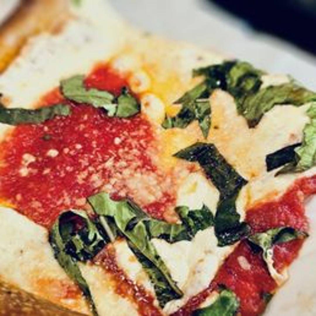 A square slice pizza topped with fresh mozzarella, house-made tomato sauce, basil, olive oil, and a sprinkle of parmesan cheese, baked to perfection with a crispy crust.