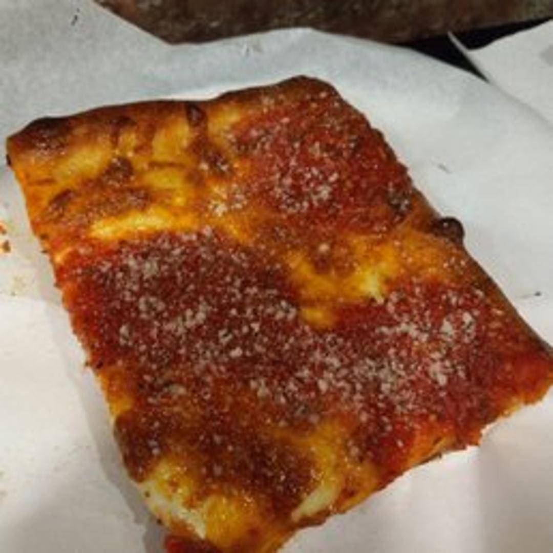 Thick-crust square pizza with crispy, caramelized edges, topped with mozzarella cheese, signature spicy pepperoni cups, and a drizzle of house-made marinara sauce.