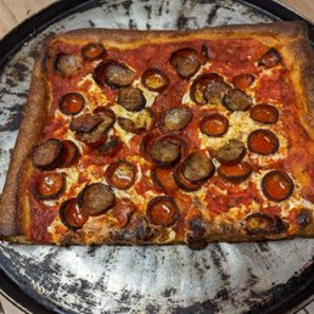 A square slice covered in a variety of savory meats, including pepperoni, sausage, and other flavorful toppings, on top of Prince Street Pizza's crispy crust, signature tomato sauce, and melted cheese.