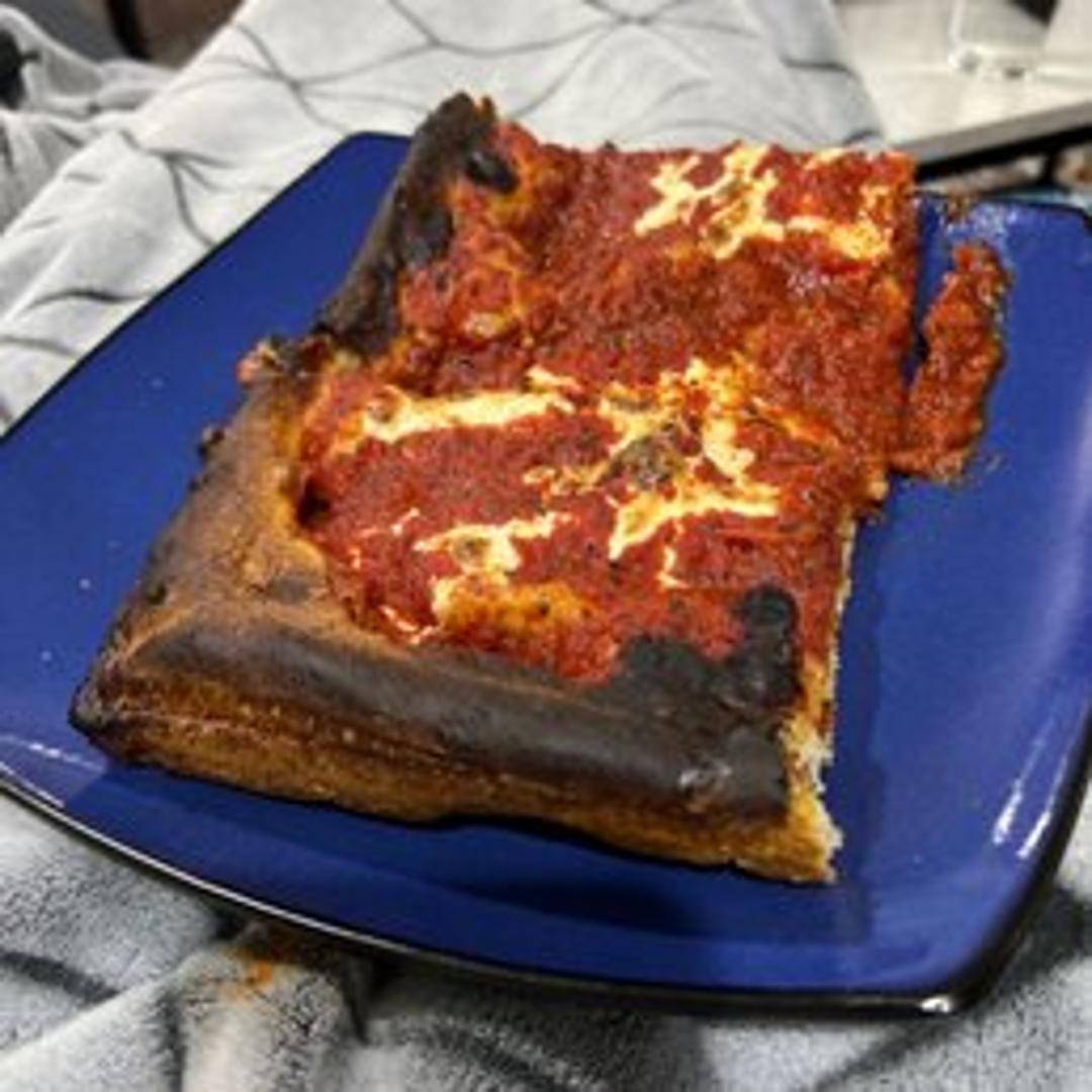 Prince Street Pizza's signature square slice, characterized by its thick, airy dough, a sweet and tangy tomato sauce, and a dusting of pecorino romano cheese.