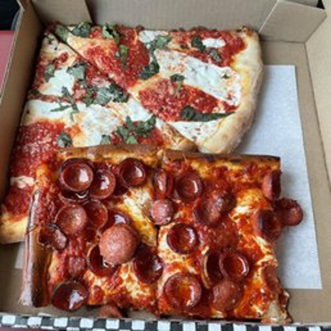 A square slice adorned with small, thick-cut pepperoni that curl into crispy, savory cups as they bake, atop Prince Street Pizza's signature crust, sweet tomato sauce and melted cheese.