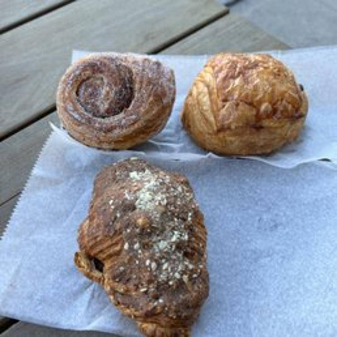 A sweet and sticky pastry made from croissant dough, rolled in cinnamon sugar and citrus zest. The bun is baked until golden brown and caramelized, offering a combination of sweet, spiced, and buttery flavors.