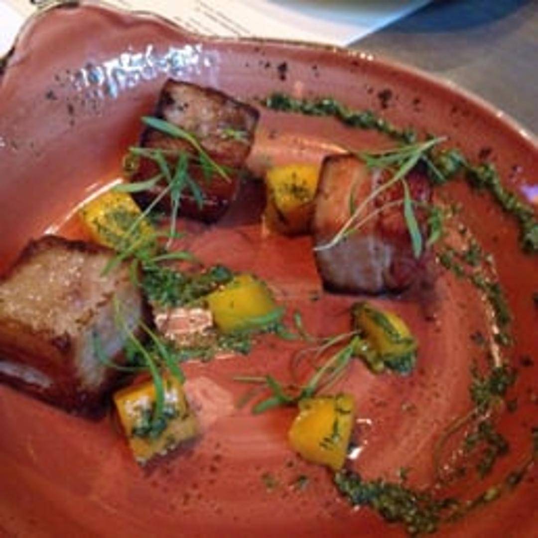 Crispy, melt-in-your-mouth pork belly, slow-braised and pan-seared to perfection, offering a rich and savory bite. Often served with a complementary sweet or tangy glaze and a fresh garnish.