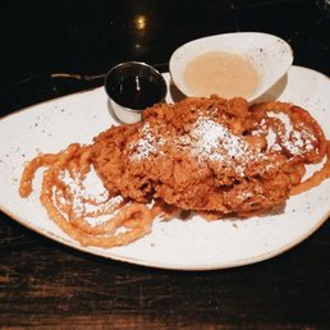 A unique and playful take on comfort food, combining our perfectly seasoned crispy fried chicken with a light, airy, and golden funnel cake, typically dusted with powdered sugar for a delightful balance.