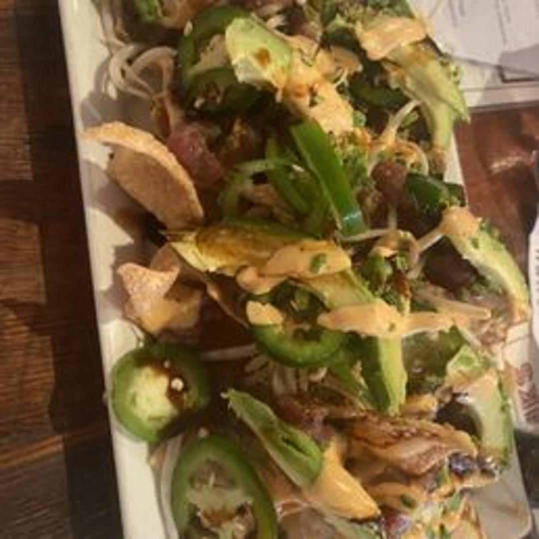 A vibrant bowl featuring sushi-grade tuna marinated in a flavorful poke sauce, served over rice with a medley of fresh vegetables, seaweed salad, avocado, and sesame seeds.