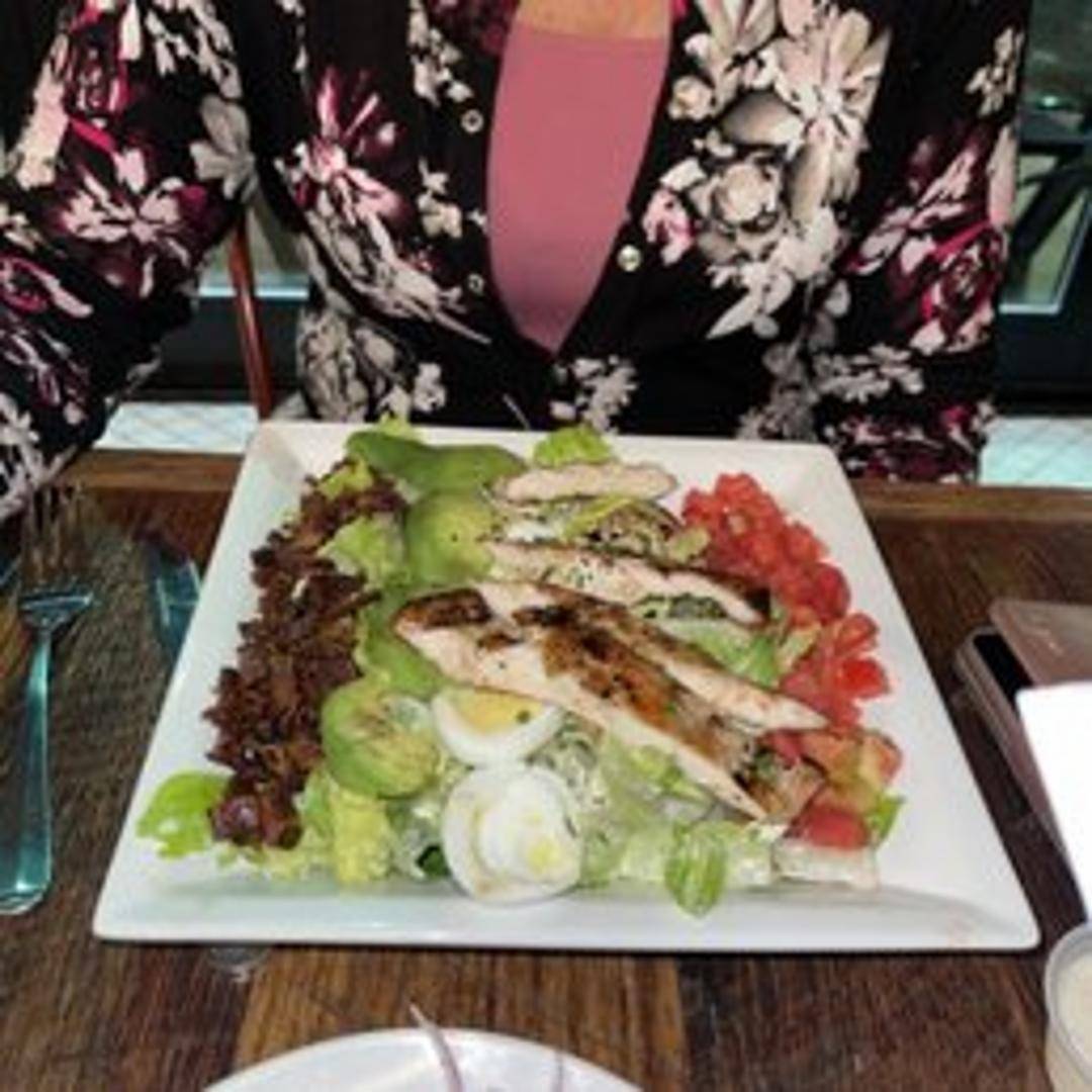 A classic Cobb salad featuring grilled chicken, crisp bacon, hard-boiled egg, avocado, blue cheese, and tomatoes arranged artfully over a bed of mixed greens with your choice of dressing.