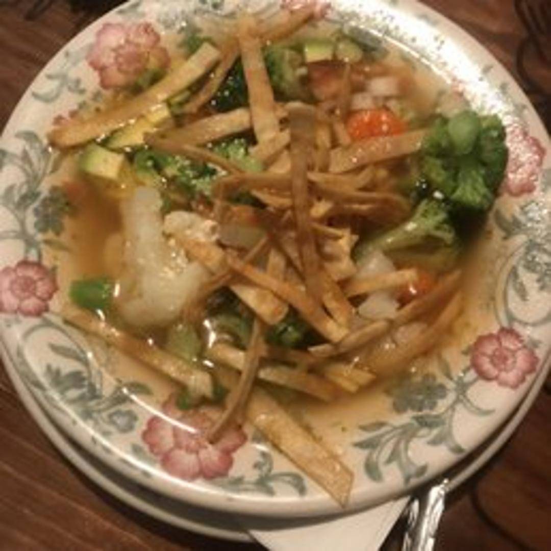 A flavorful broth-based soup with shredded chicken, avocado, cheese, and crispy tortilla strips. Garnished with lime.