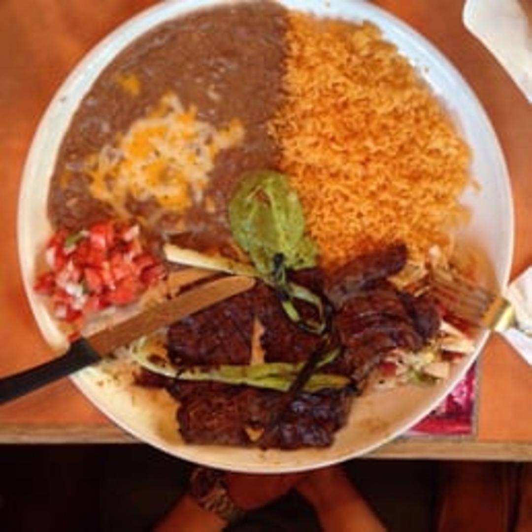 Grilled thinly sliced steak, marinated in citrus and spices. Served with rice, beans, grilled onions, and warm tortillas.