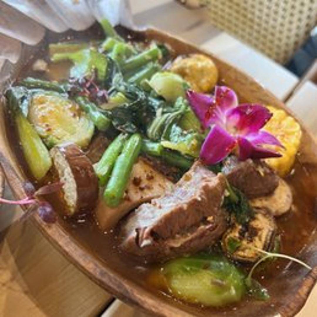 A hearty Filipino beef marrow stew. Slow-cooked beef shanks simmered in a clear broth with vegetables, such as cabbage, corn, and potatoes. Rich in collagen and deeply flavorful, this soup is a comforting and nourishing dish.