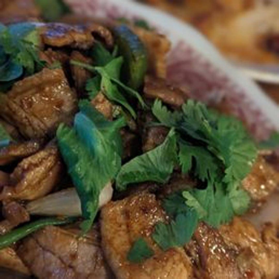 Slow-cooked pork belly, tender and rich in flavor, often served sliced.