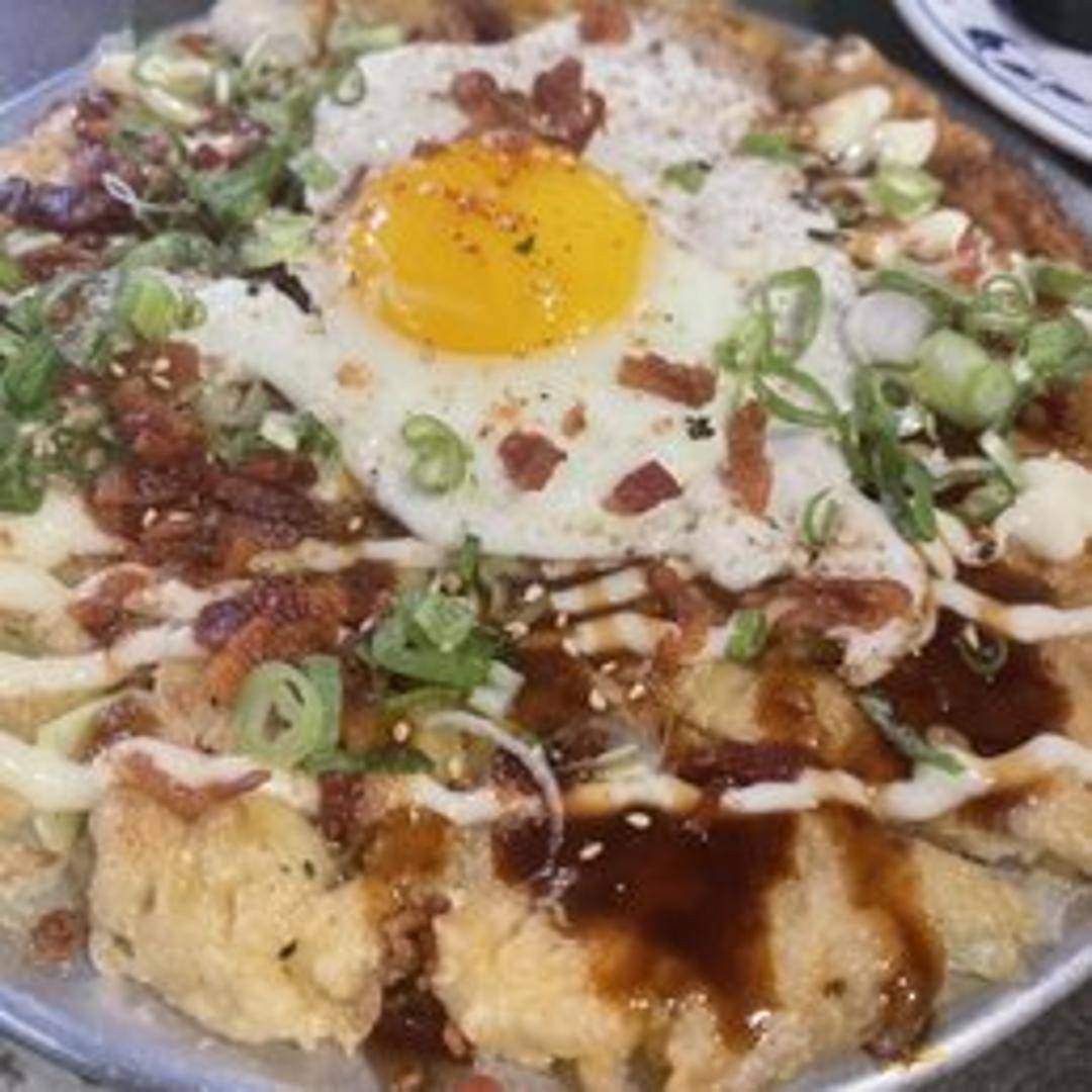 Quán Hapa's distinctive take on the classic Japanese savory pancake. This griddled masterpiece is crafted with a fluffy batter, generously filled with shredded cabbage and your choice of savory ingredients. It's beautifully topped with a drizzle of sweet and tangy okonomiyaki sauce, a delicate swirl of Japanese mayonnaise, dancing bonito flakes (katsuobushi), and a garnish of dried green seaweed (aonori).