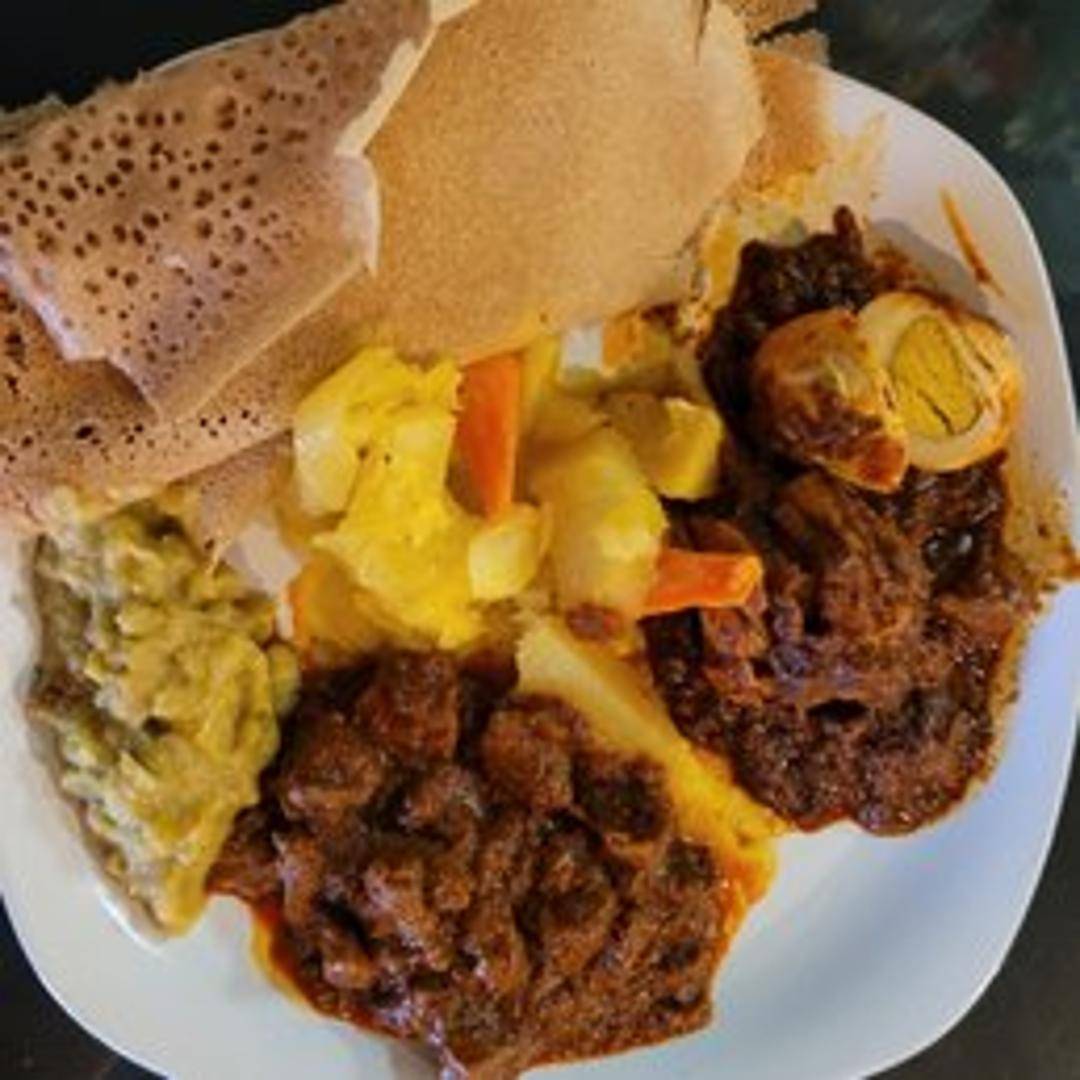 A combination platter featuring a variety of meat dishes served on injera bread. Typically includes a sampling of lamb tibs, beef stew, and chicken stew, offering a taste of Ethiopian meat cuisine.