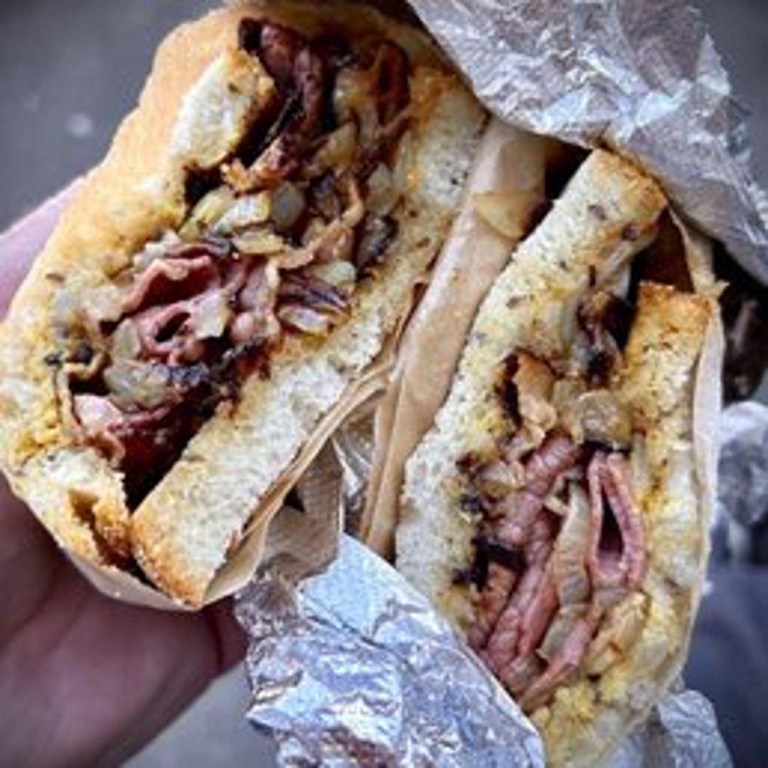 Thinly sliced, seasoned and smoked pastrami piled high on rye bread. Served hot with a smear of mustard. A classic deli sandwich known for its savory, smoky flavor.