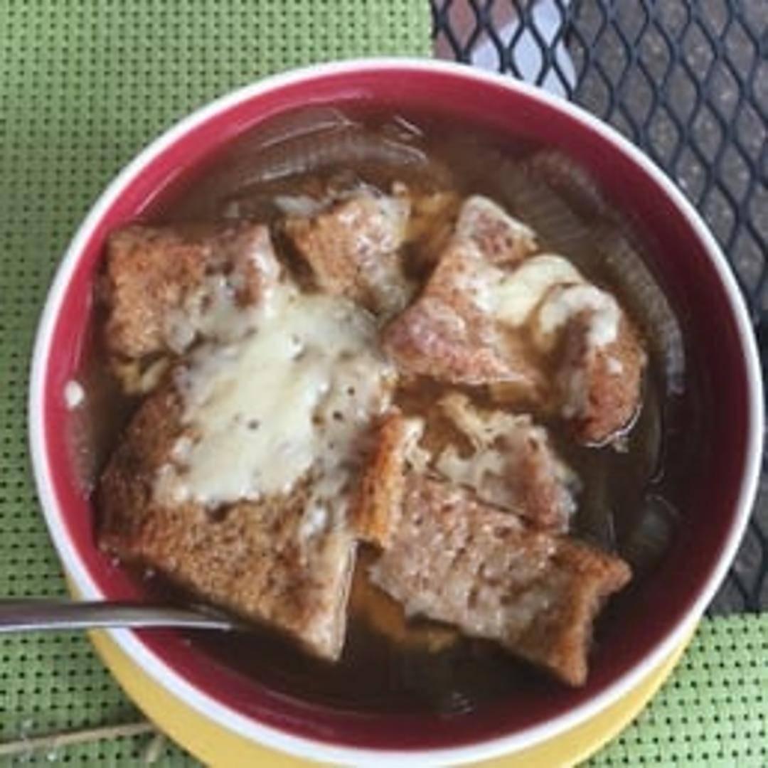 A rich and savory broth simmered with caramelized onions, topped with a toasted baguette slice and melted Gruyère cheese.