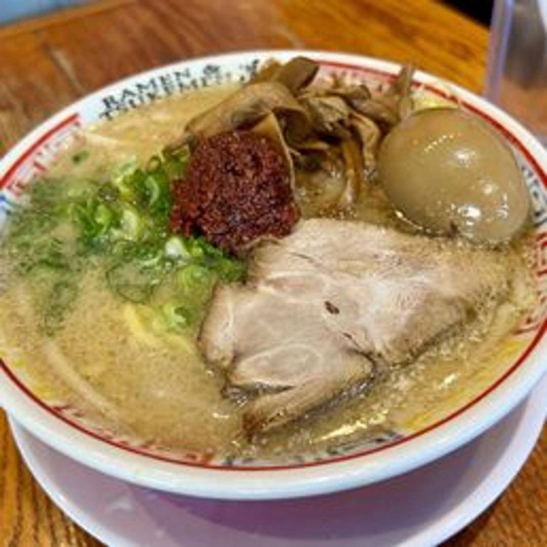 Ramen noodles in a rich and creamy white miso broth with a spicy kick, topped with various toppings such as chashu pork, vegetables, and a seasoned egg.